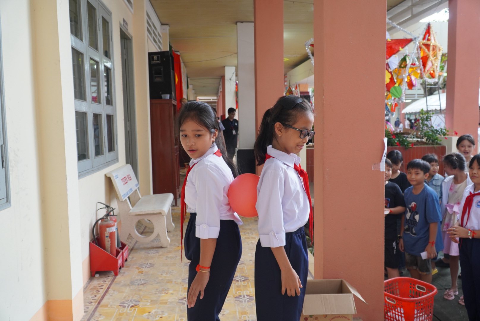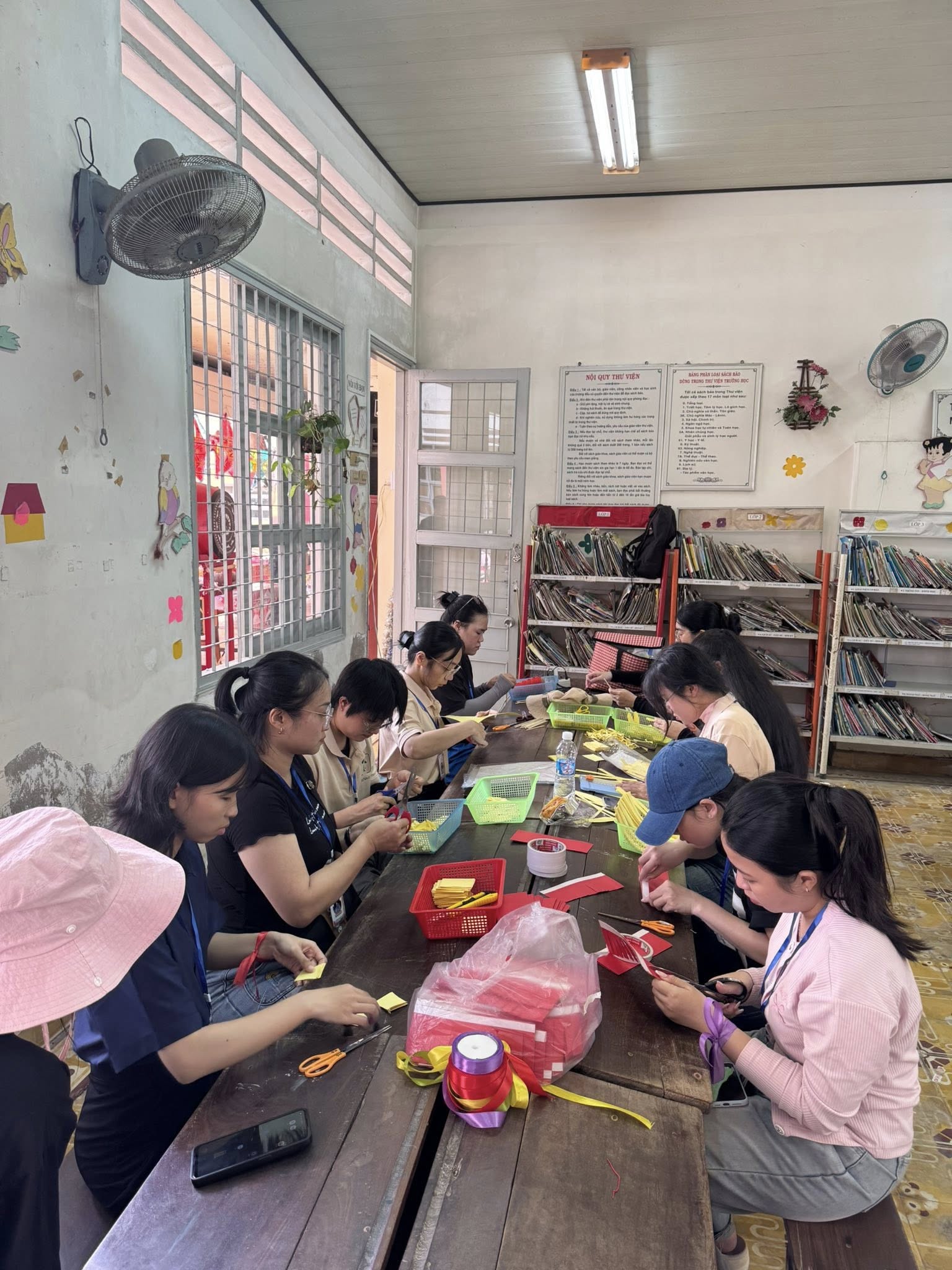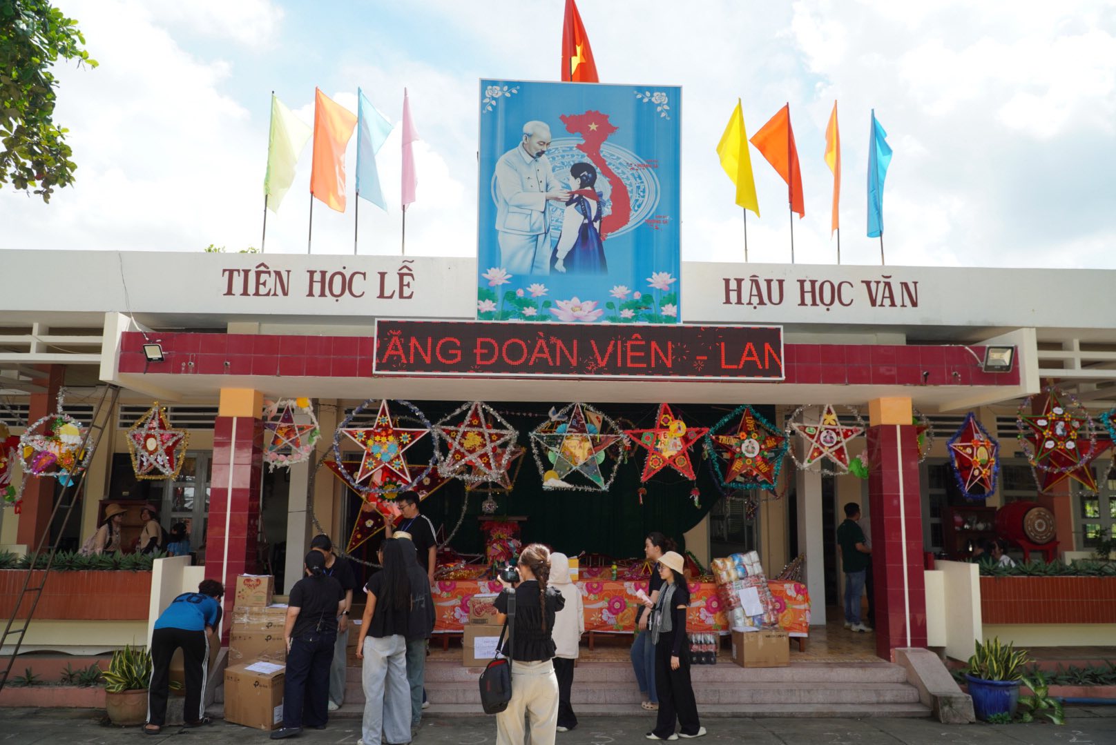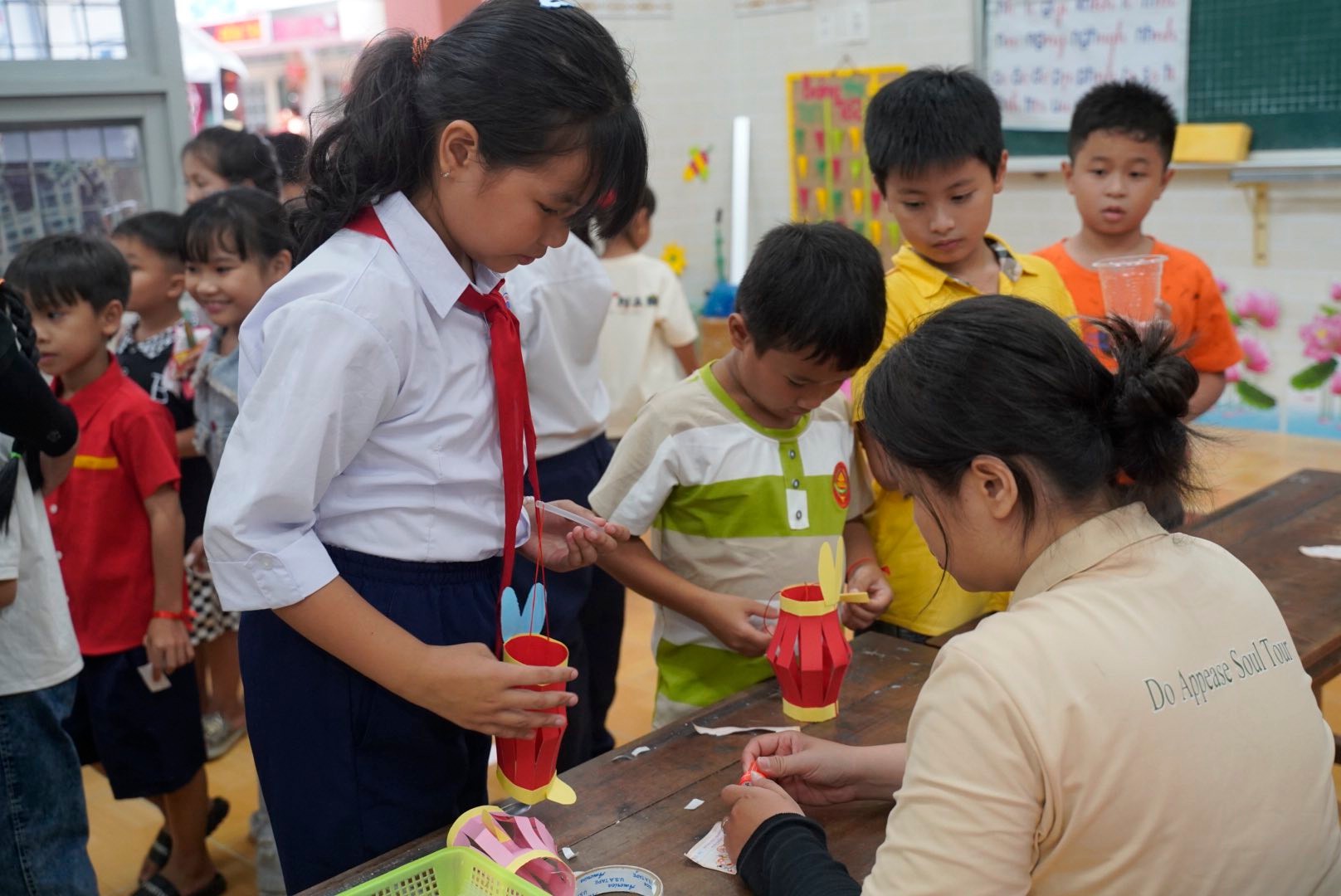 Giữa ngôi trường nhỏ xinh, từng bàn tay miệt mài cắt dán làm lồng đèn, chọn lọc những phần quà dễ thương… từng chút một gom lại thành niềm vui gửi đến các em nhỏ học sinh Ấp Bắc.