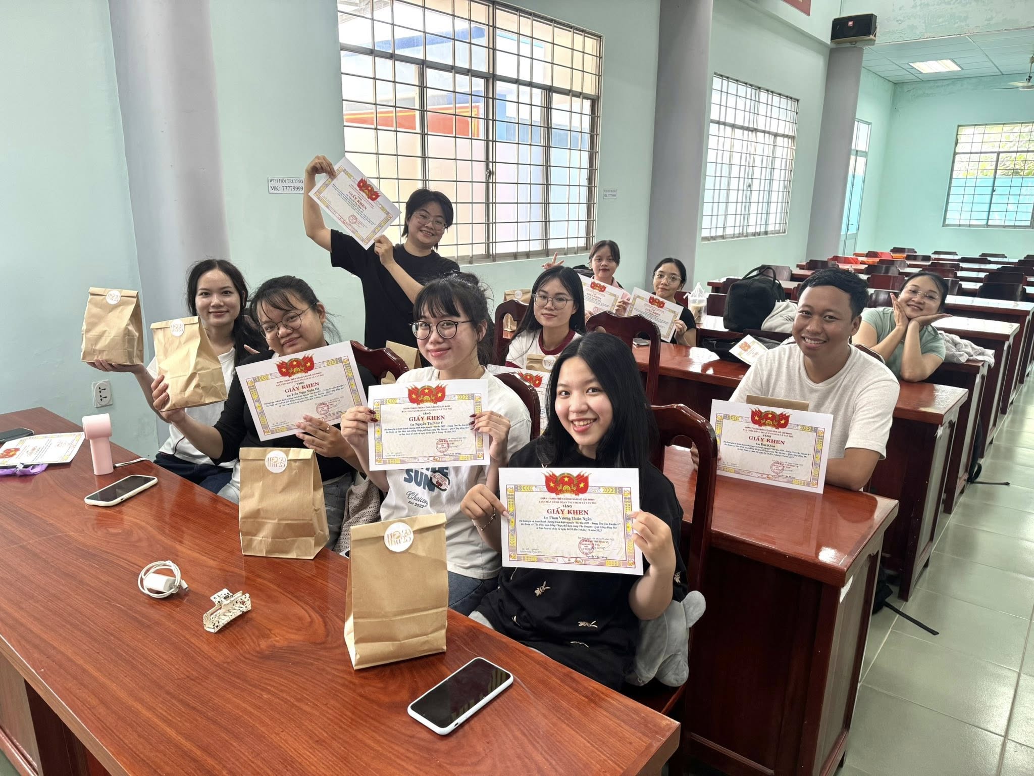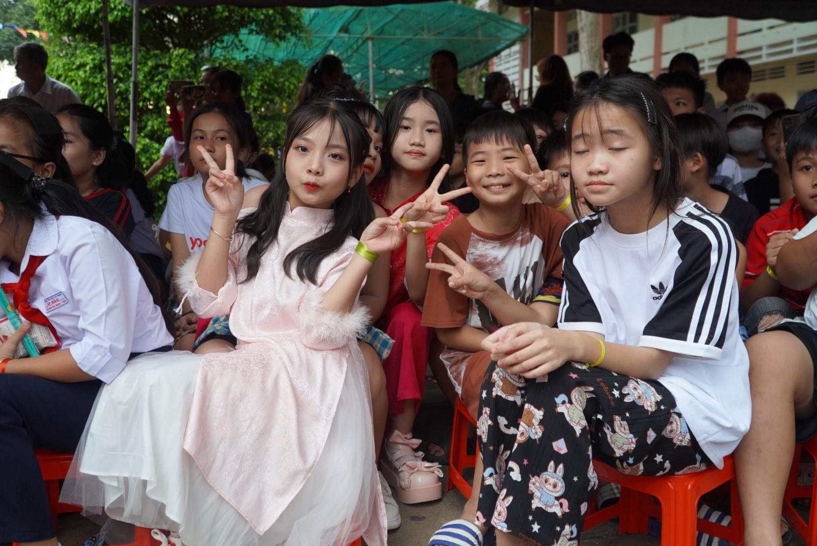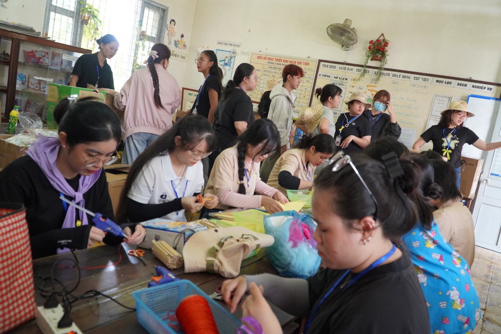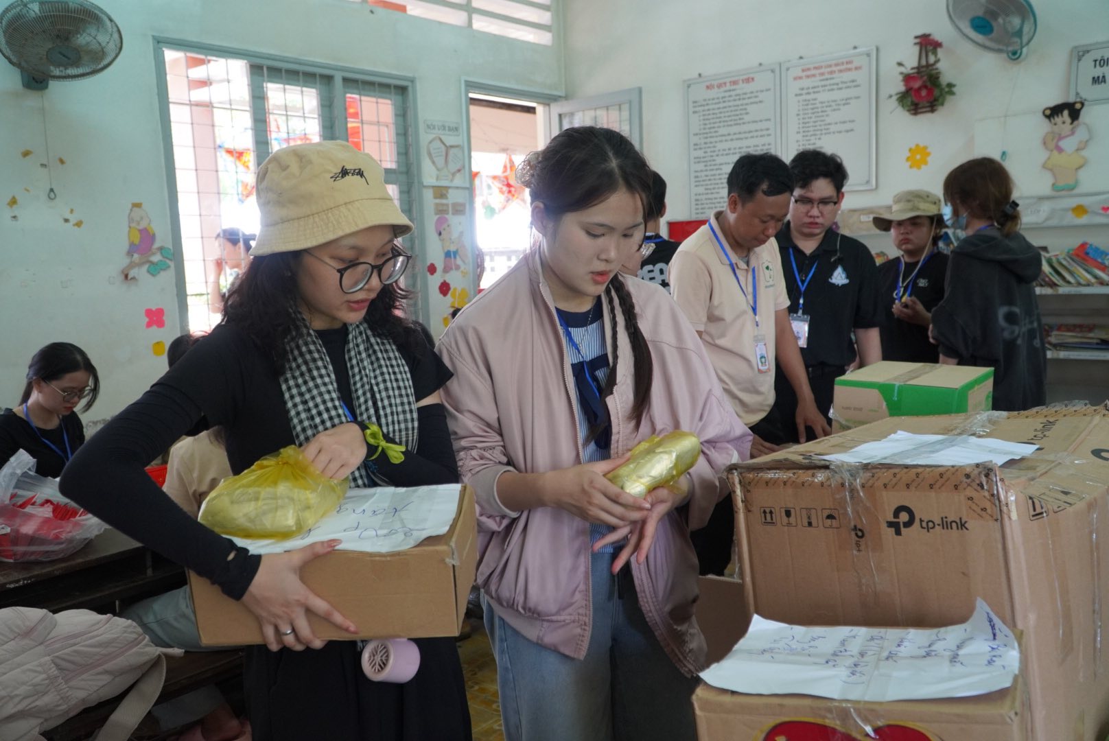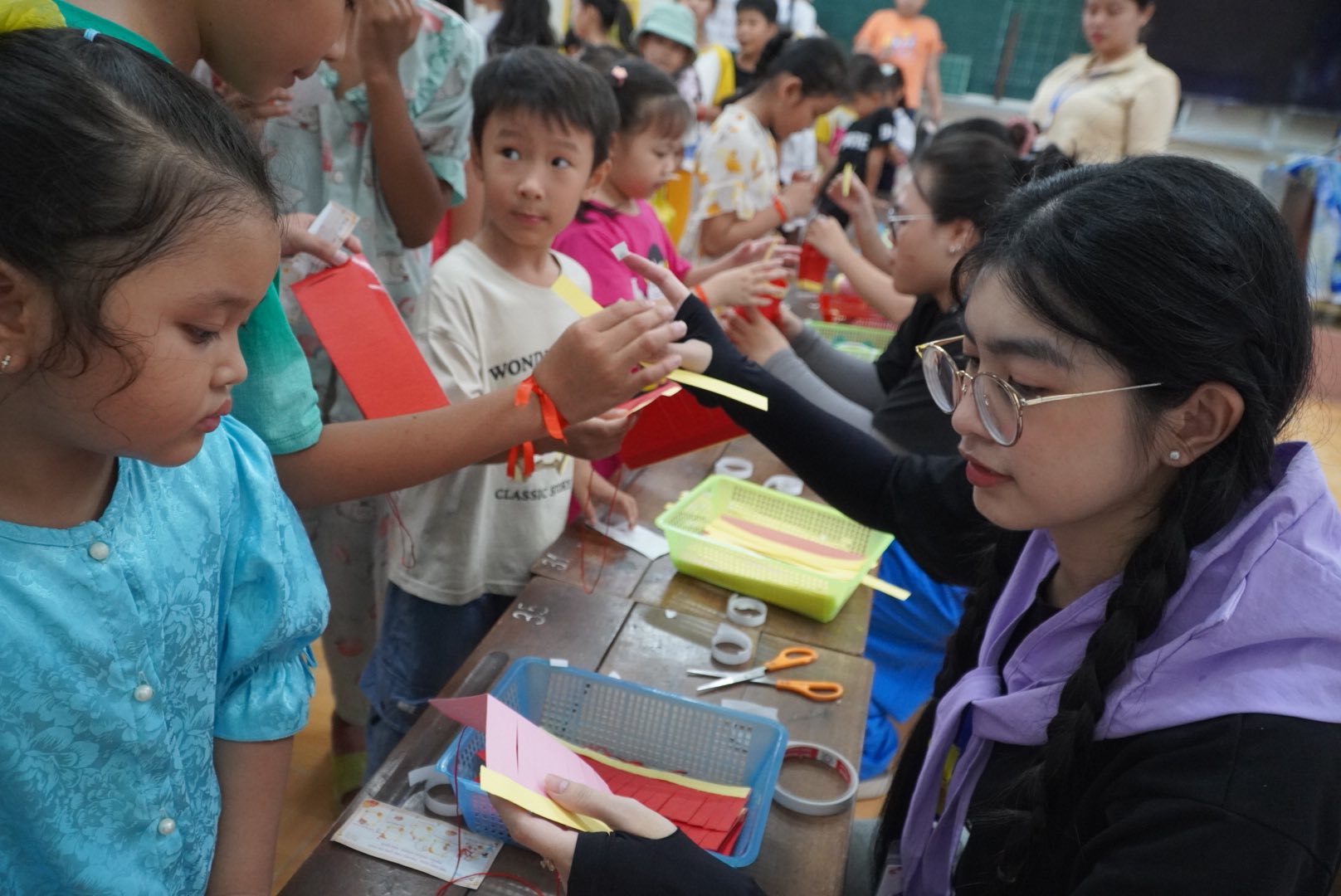 Giữa ngôi trường nhỏ xinh, từng bàn tay miệt mài cắt dán làm lồng đèn, chọn lọc những phần quà dễ thương… từng chút một gom lại thành niềm vui gửi đến các em nhỏ học sinh Ấp Bắc.